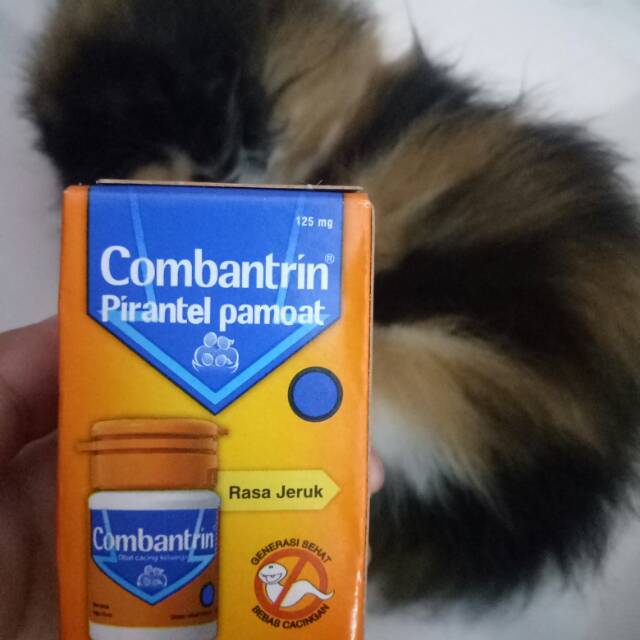 - Anak Kucing. Jika kucing masih anak-anak dibawah 3 bulan beri combantrin anak rasa jeruk hehe. 1 tablet obat Vermox mengandung berat 150mg.